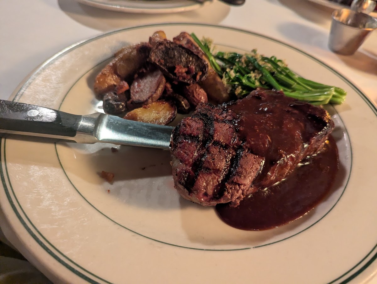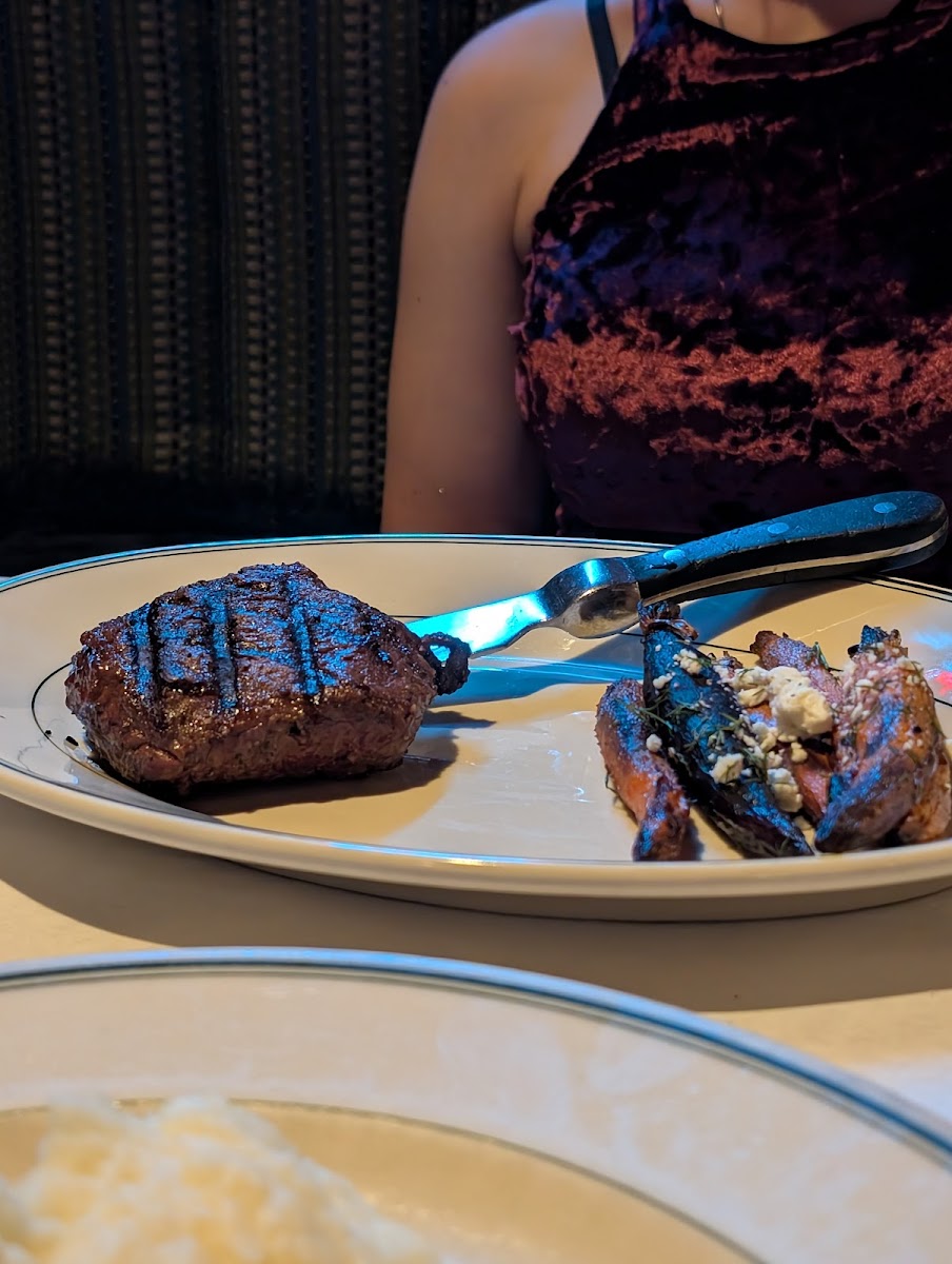 The food was delicious as to be expected. However, it's not the best steak I've ever had. Hence why they get a four out of five. I had the fillet, my dad had the prime rib. The beef and brie is always super yummy and the creme brulee was melt in your mouth. Service was excellent. Consistent, delicious and tasty.